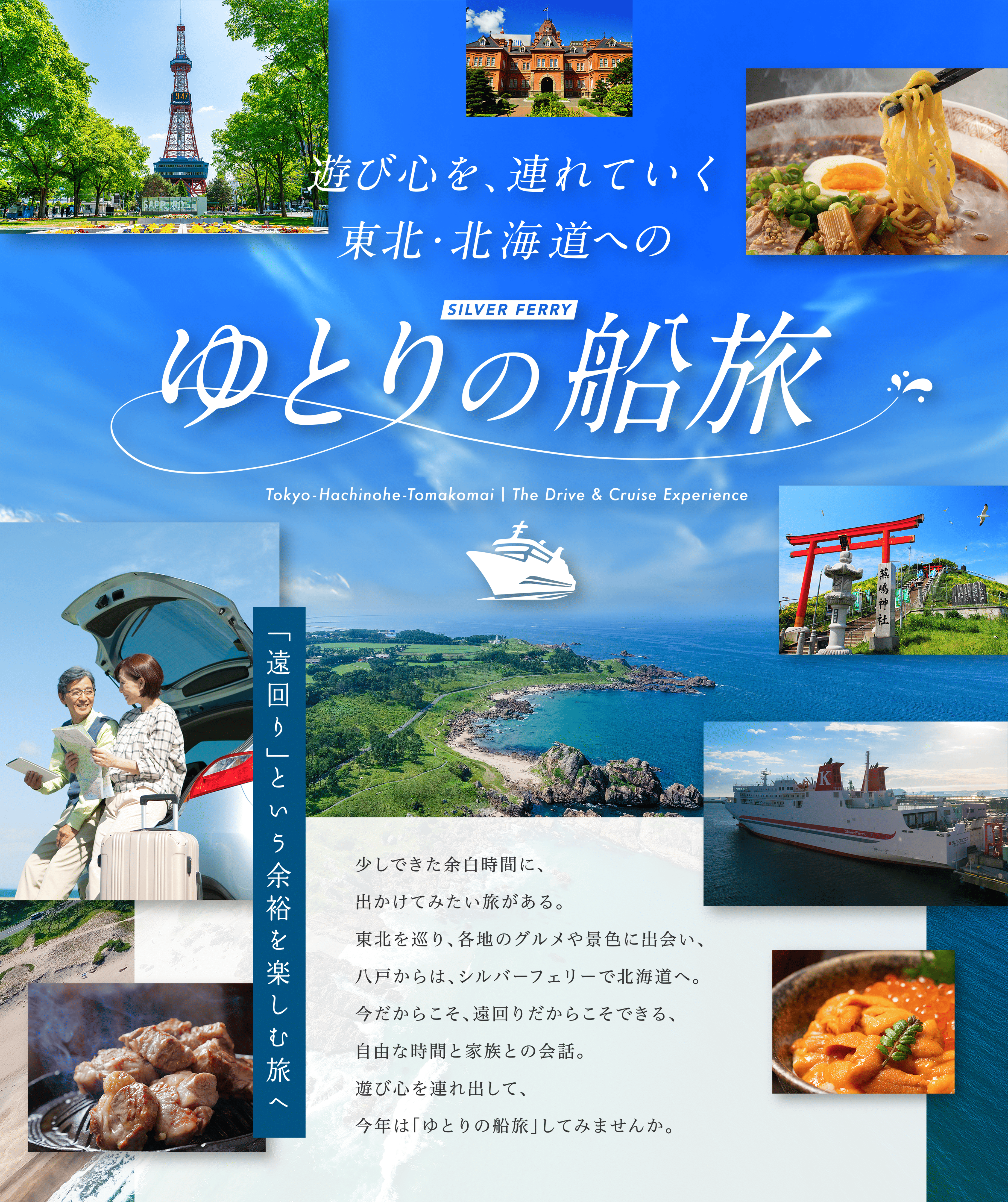 愛車での旅なら、寄り道も予定変更も思いのまま。東北の温泉や海辺の町を気ままに巡り、八戸からフェリーへ。荷物は積んだまま、くつろぎながら北海道へと向かいます。